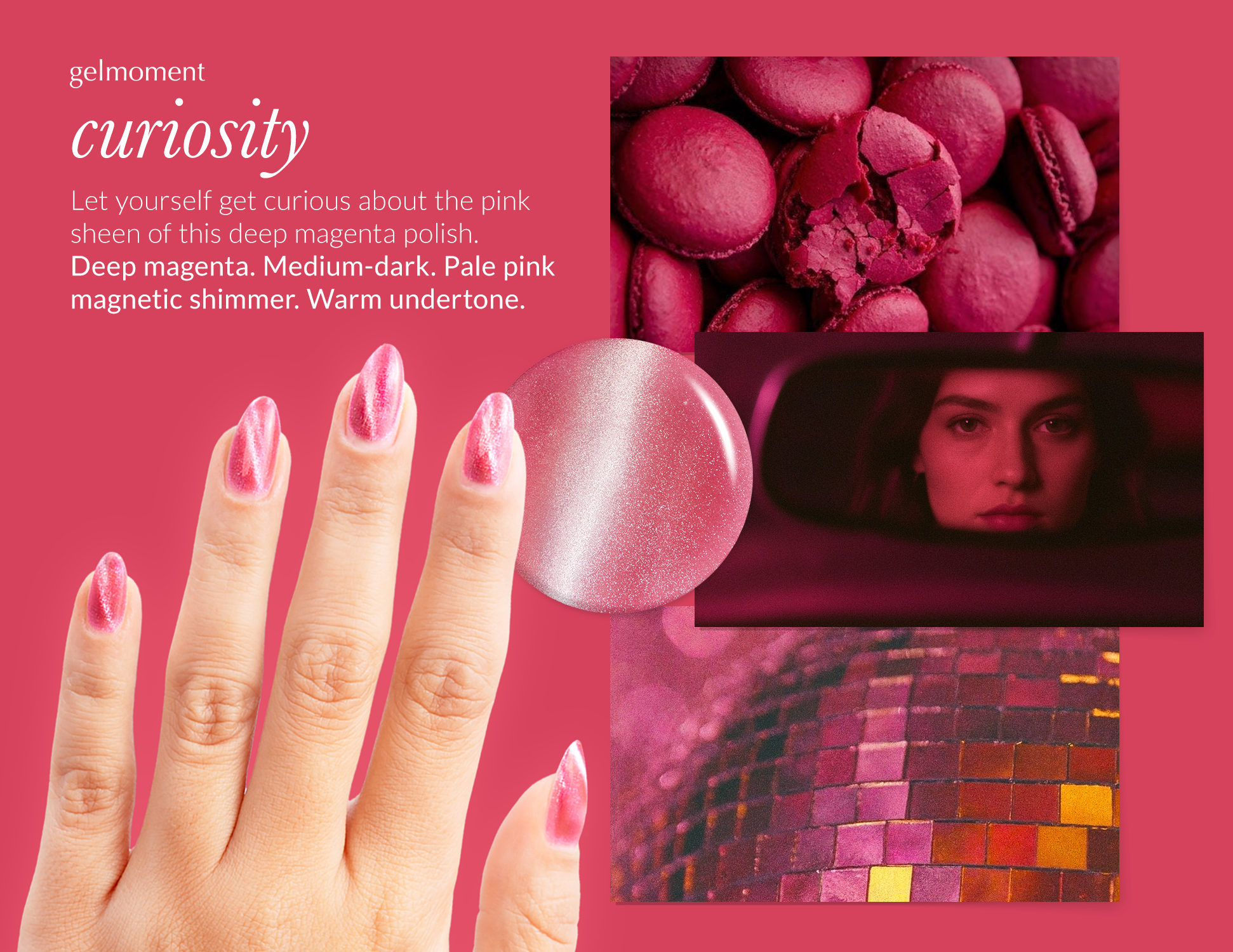 Deep magenta. Medium-dark. Pale pink magnetic shimmer. Opaque. Warm undertone.