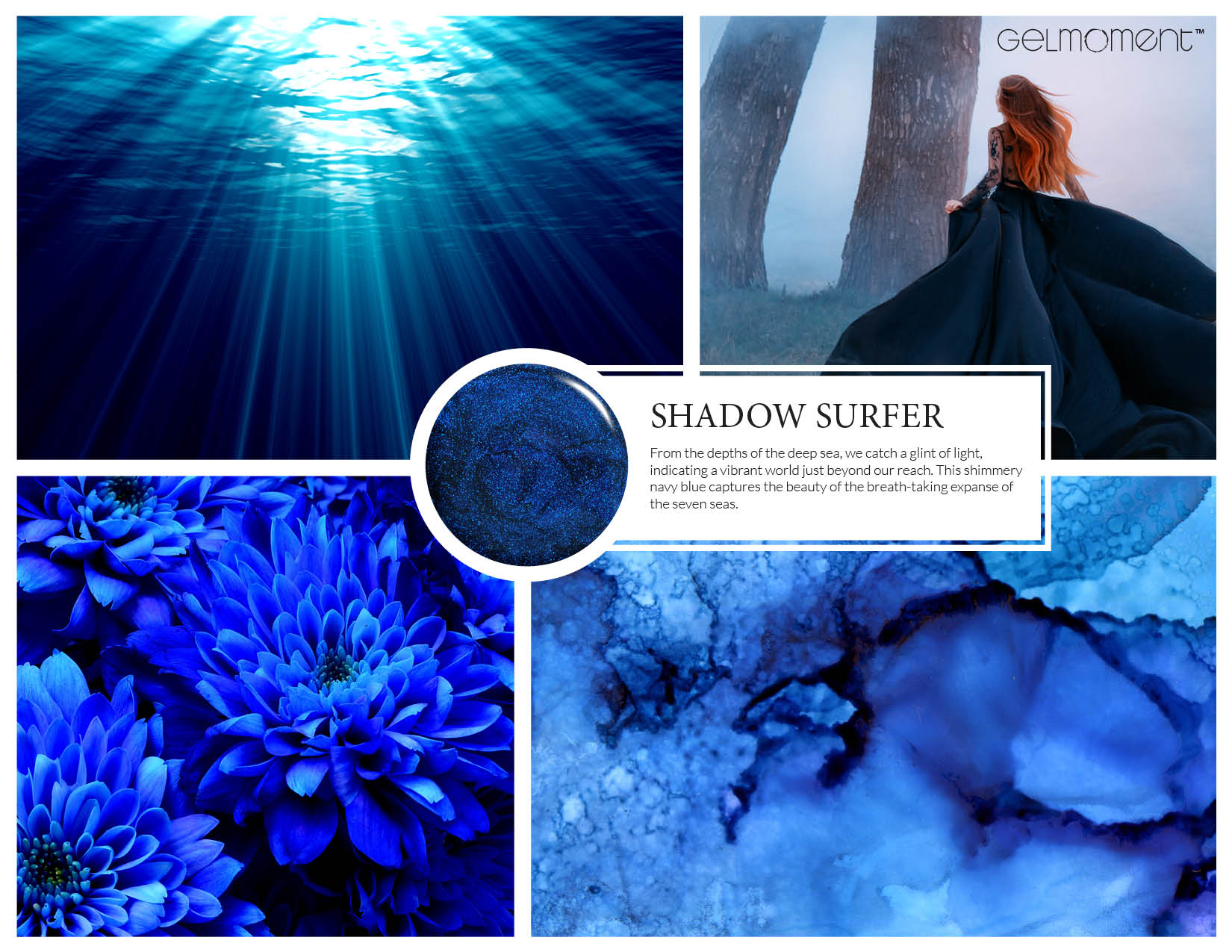 Pale blue sparkles surf along this royal blue polish.